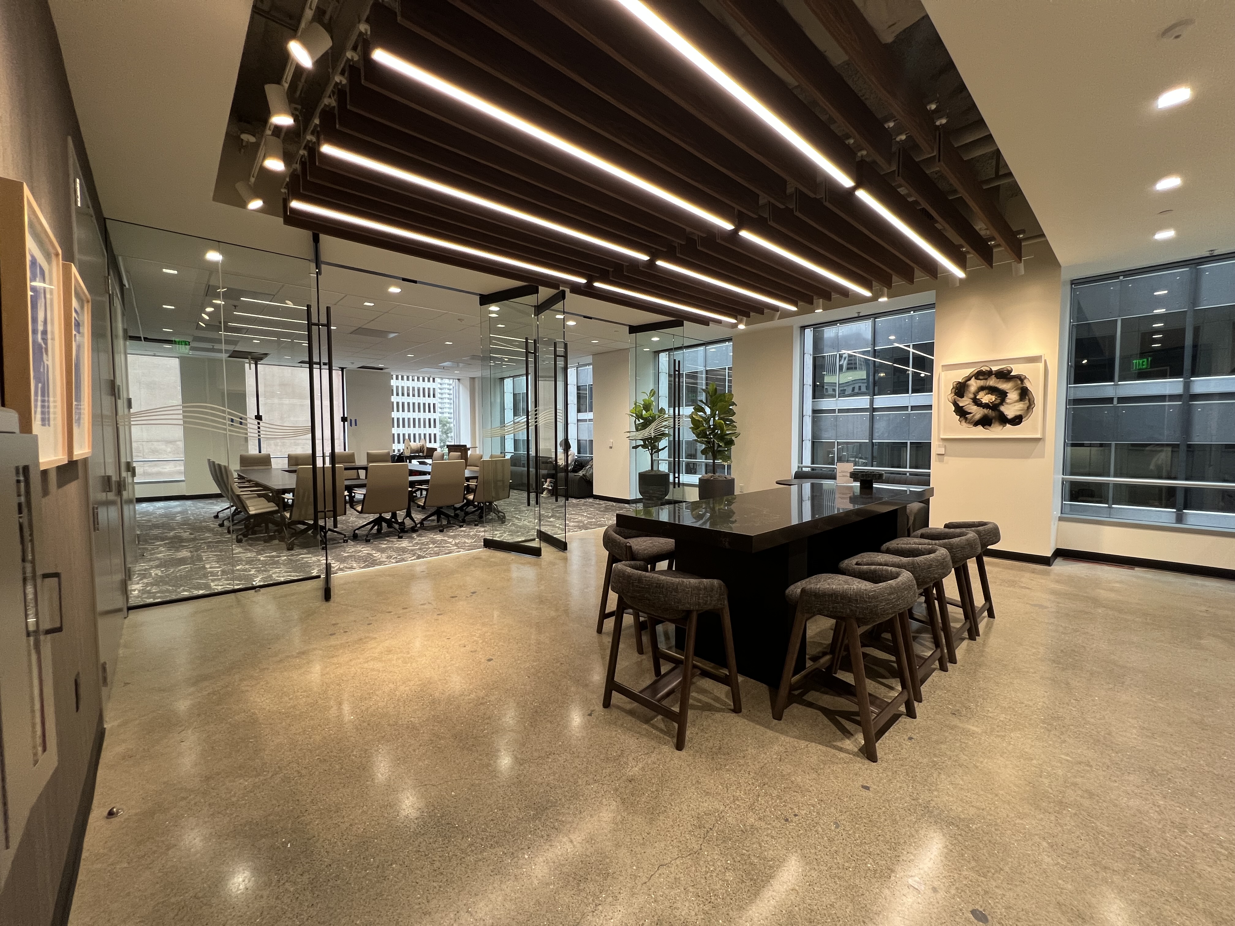 The Conference Center is free for tenant use and available by reservation Monday through Friday, 8 AM to 5 PM. The space accommodates up to 30 guests and features an AV system with a simple hardwired connectivity. Amenities include a wet bar, Bevi water machine, and a coffee machine. A convenient, fully equipped space designed to make on-site meetings easier.